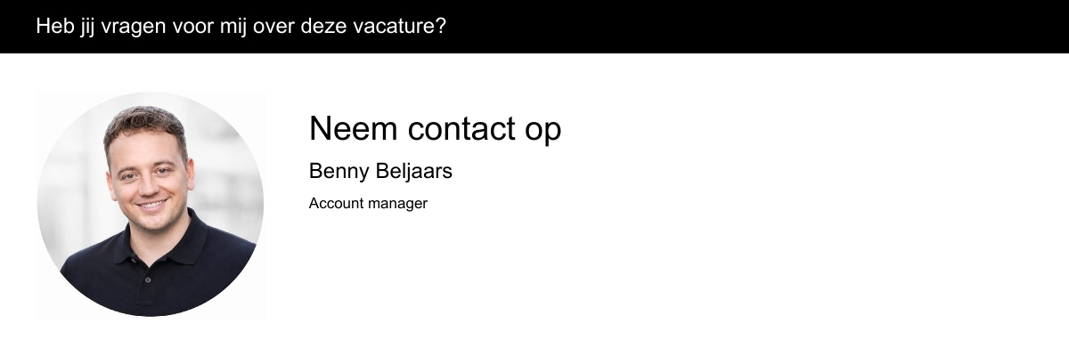 Zie jij jezelf terug in deze vacature, of ken je iemand die hier perfect bij past? Neem dan contact op met Benny Beljaars voor meer informatie. We denken graag met je mee.